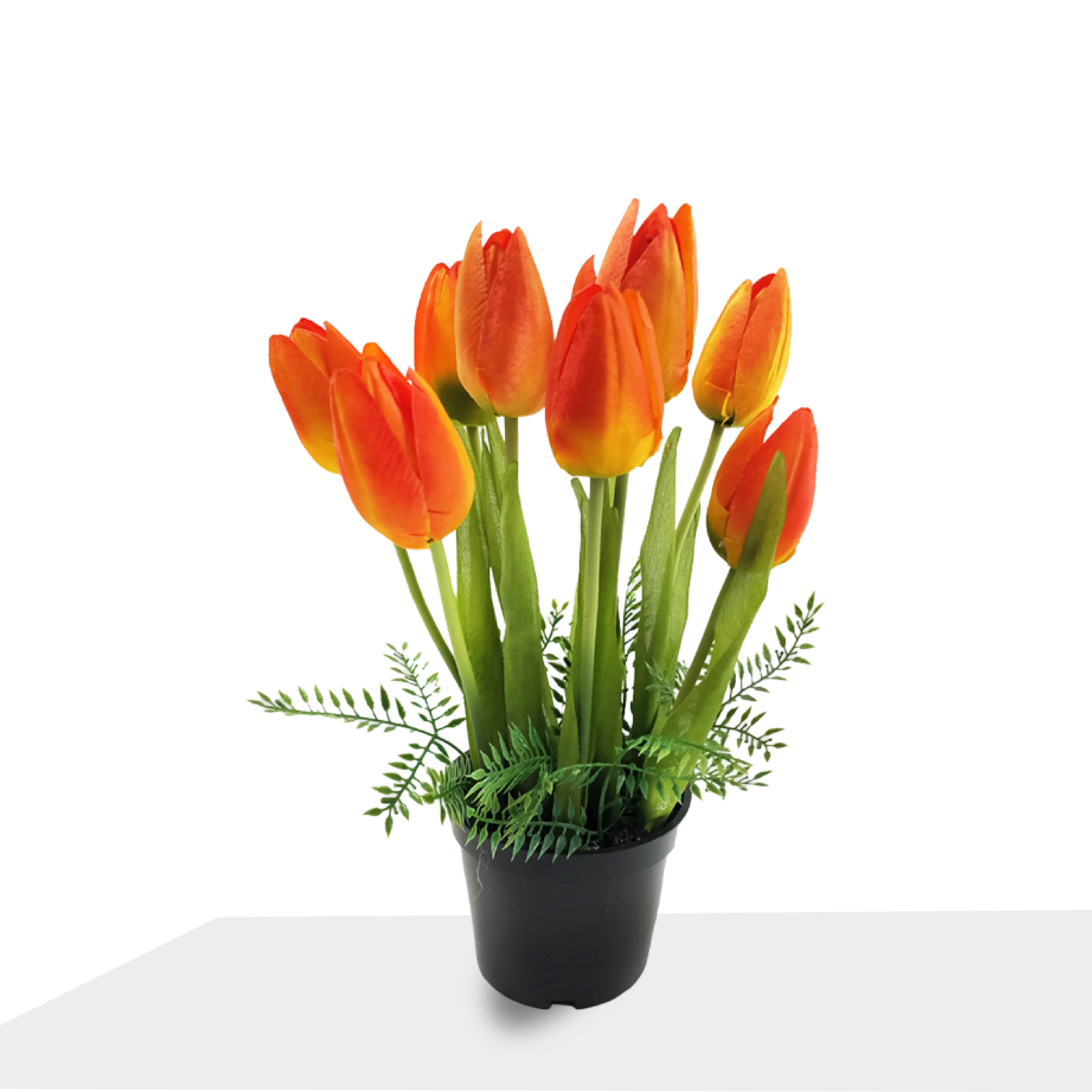 1. الأزهار: تُصنع الأزهار من البلاستيك أو القماش، وتكون بتلاتها ناعمة وملونة بألوان زاهية مثل الأحمر، الوردي، الأصفر، الأبيض، والأرجواني. تُصمم الأزهار بتفاصيل دقيقة تحاكي بتلات التوليب الطبيعية، بما في ذلك تدرجات اللون والأطراف المموجة. تُرتب الأزهار بشكل جميل بحيث تكون موزعة بشكل طبيعي على الفروع.